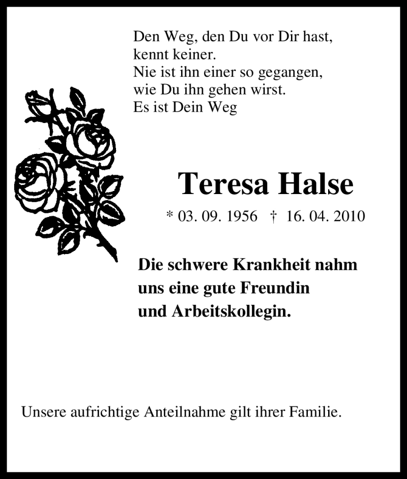 Hier finden Sie alle Traueranzeigen aus der Zeitung, die bisher für Teresa Halse erschienen sind. Weitere Traueranzeigen, die in der Zeitung erscheinen, werden hier ebenfalls aufgelistet