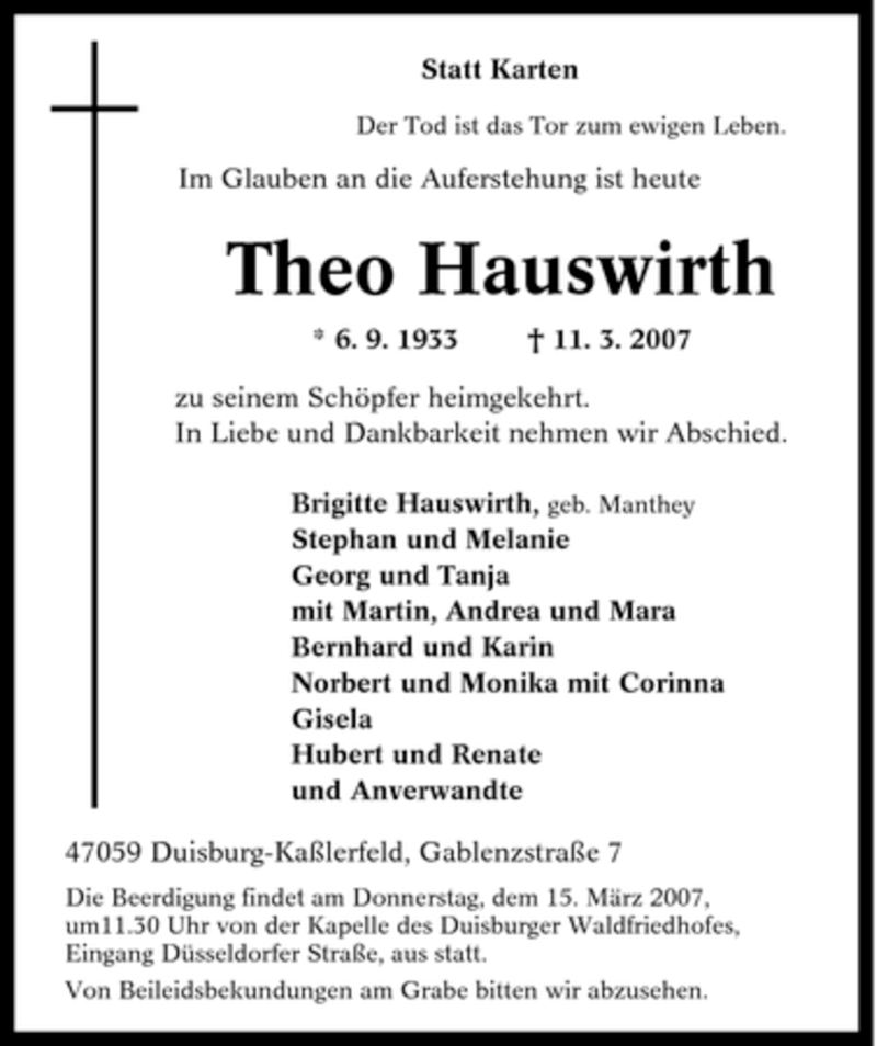 Hier finden Sie alle Traueranzeigen aus der Zeitung, die bisher für Theo Hauswirth erschienen sind. Weitere Traueranzeigen, die in der Zeitung erscheinen, werden hier ebenfalls aufgelistet