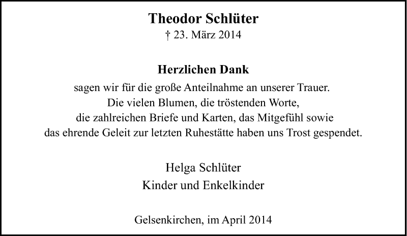 Hier finden Sie alle Traueranzeigen aus der Zeitung, die bisher für Theo Schlüter erschienen sind. Weitere Traueranzeigen, die in der Zeitung erscheinen, werden hier ebenfalls aufgelistet