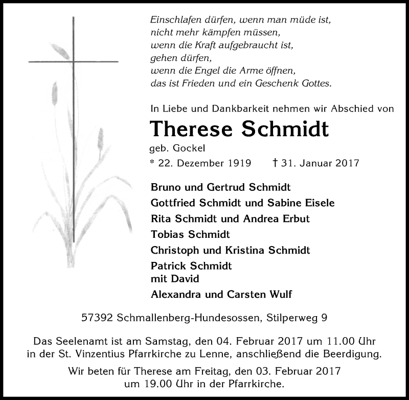 Hier finden Sie alle Traueranzeigen aus der Zeitung, die bisher für Therese Schmidt erschienen sind. Weitere Traueranzeigen, die in der Zeitung erscheinen, werden hier ebenfalls aufgelistet
