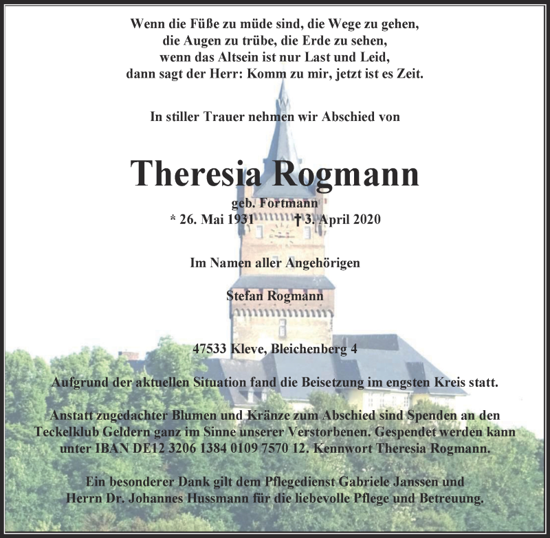 Hier finden Sie alle Traueranzeigen aus der Zeitung, die bisher für Theresia Rogmann erschienen sind. Weitere Traueranzeigen, die in der Zeitung erscheinen, werden hier ebenfalls aufgelistet
