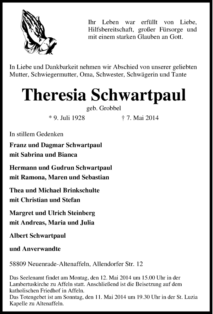 Hier finden Sie alle Traueranzeigen aus der Zeitung, die bisher für Theresia Schwartpaul erschienen sind. Weitere Traueranzeigen, die in der Zeitung erscheinen, werden hier ebenfalls aufgelistet