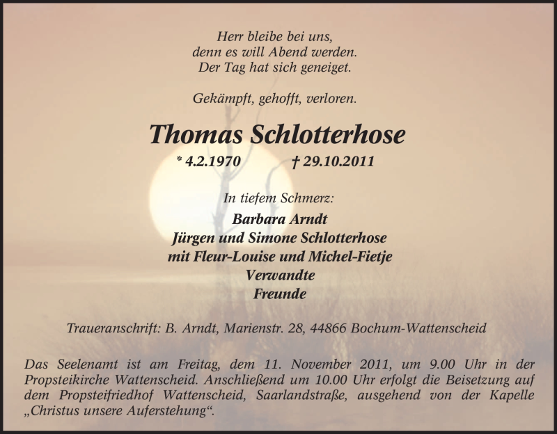Hier finden Sie alle Traueranzeigen aus der Zeitung, die bisher für Thomas Schlotterhose erschienen sind. Weitere Traueranzeigen, die in der Zeitung erscheinen, werden hier ebenfalls aufgelistet