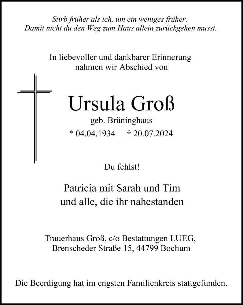 Hier finden Sie alle Traueranzeigen aus der Zeitung, die bisher für Ursula Groß erschienen sind. Weitere Traueranzeigen, die in der Zeitung erscheinen, werden hier ebenfalls aufgelistet