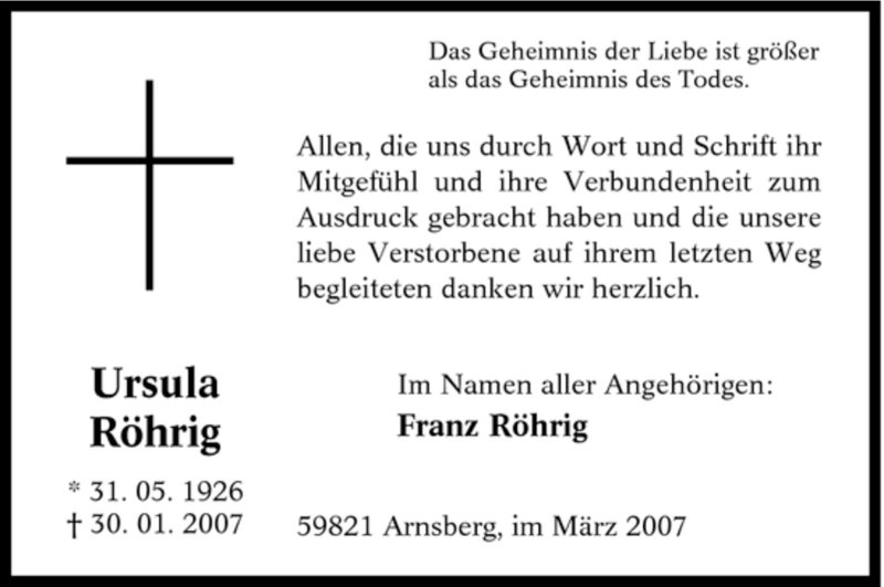 Hier finden Sie alle Traueranzeigen aus der Zeitung, die bisher für Ursula Röhrig erschienen sind. Weitere Traueranzeigen, die in der Zeitung erscheinen, werden hier ebenfalls aufgelistet