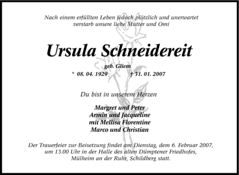 Hier finden Sie alle Traueranzeigen aus der Zeitung, die bisher für Ursula Schneidereit erschienen sind. Weitere Traueranzeigen, die in der Zeitung erscheinen, werden hier ebenfalls aufgelistet