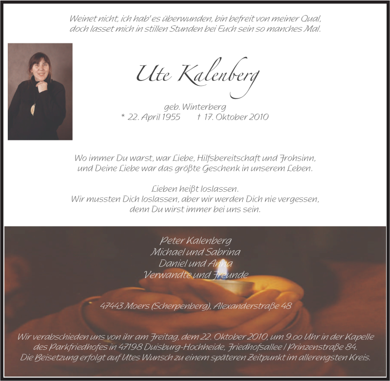 Hier finden Sie alle Traueranzeigen aus der Zeitung, die bisher für Ute Kalenberg erschienen sind. Weitere Traueranzeigen, die in der Zeitung erscheinen, werden hier ebenfalls aufgelistet