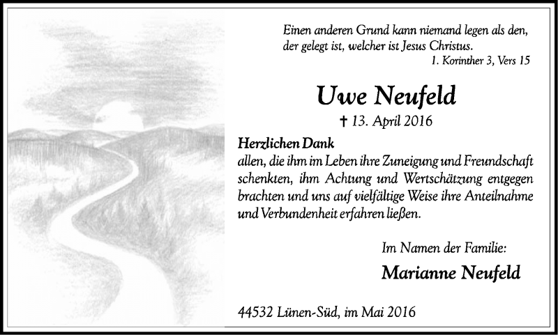 Hier finden Sie alle Traueranzeigen aus der Zeitung, die bisher für Uwe Neufeld erschienen sind. Weitere Traueranzeigen, die in der Zeitung erscheinen, werden hier ebenfalls aufgelistet