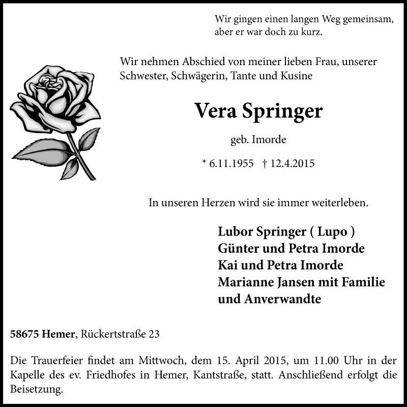 Hier finden Sie alle Traueranzeigen aus der Zeitung, die bisher für Vera Springer erschienen sind. Weitere Traueranzeigen, die in der Zeitung erscheinen, werden hier ebenfalls aufgelistet
