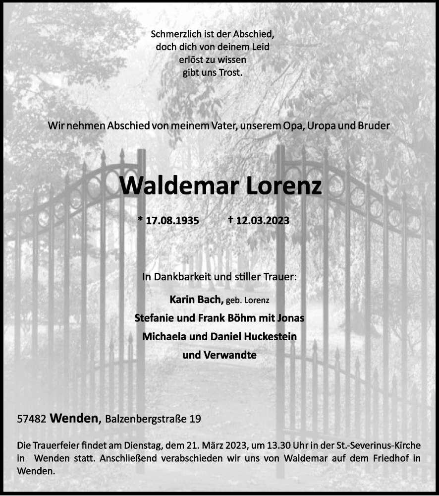 Hier finden Sie alle Traueranzeigen aus der Zeitung, die bisher für Waldemar Lorenz erschienen sind. Weitere Traueranzeigen, die in der Zeitung erscheinen, werden hier ebenfalls aufgelistet