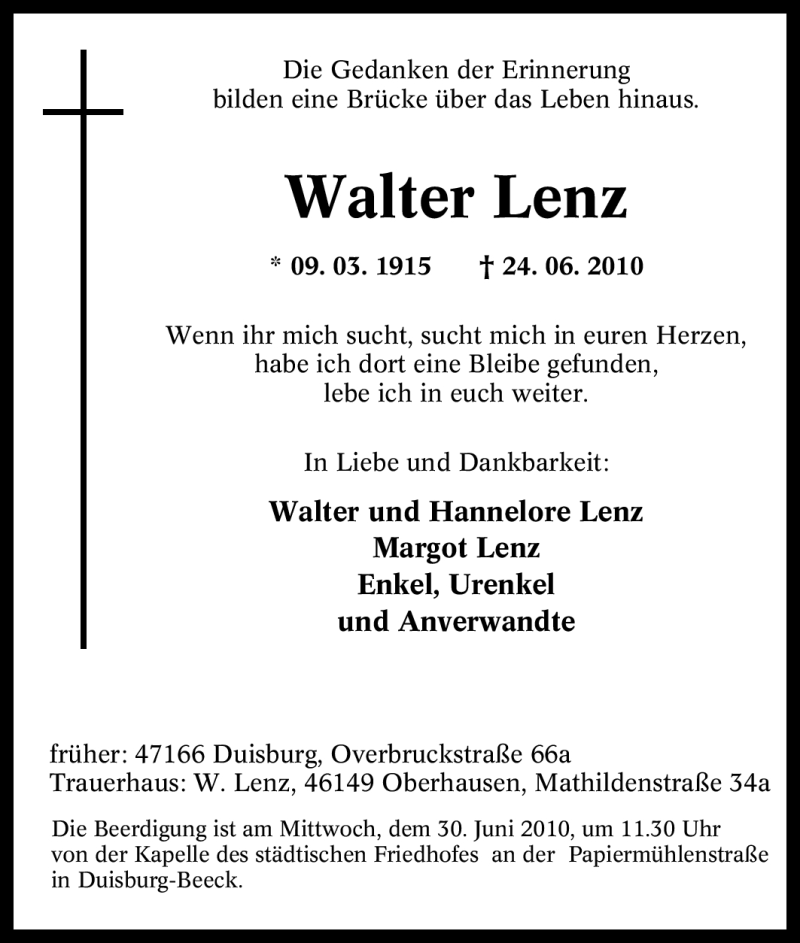 Hier finden Sie alle Traueranzeigen aus der Zeitung, die bisher für Walter Lenz erschienen sind. Weitere Traueranzeigen, die in der Zeitung erscheinen, werden hier ebenfalls aufgelistet