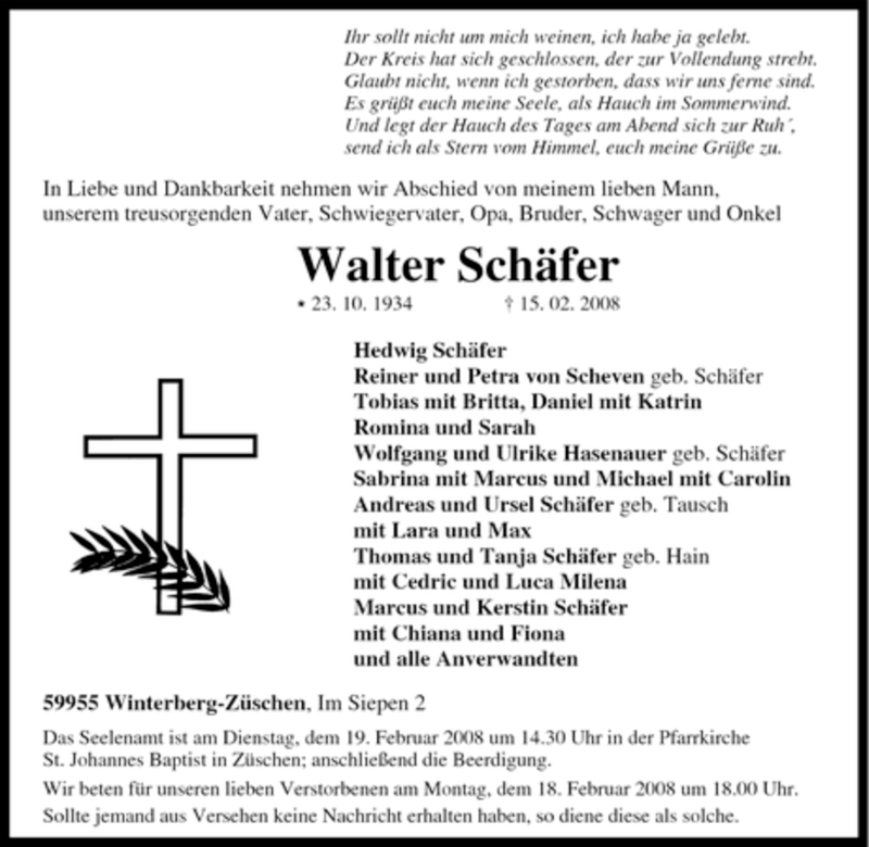 Hier finden Sie alle Traueranzeigen aus der Zeitung, die bisher für Walter Schäfer erschienen sind. Weitere Traueranzeigen, die in der Zeitung erscheinen, werden hier ebenfalls aufgelistet