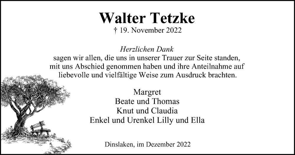 Hier finden Sie alle Traueranzeigen aus der Zeitung, die bisher für Walter Tetzke erschienen sind. Weitere Traueranzeigen, die in der Zeitung erscheinen, werden hier ebenfalls aufgelistet
