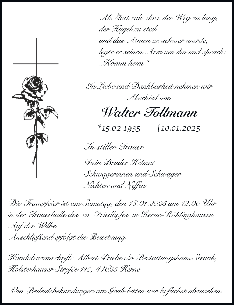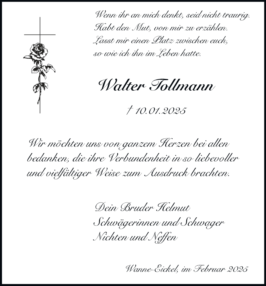 Hier finden Sie alle Traueranzeigen aus der Zeitung, die bisher für Walter Tollmann erschienen sind. Weitere Traueranzeigen, die in der Zeitung erscheinen, werden hier ebenfalls aufgelistet