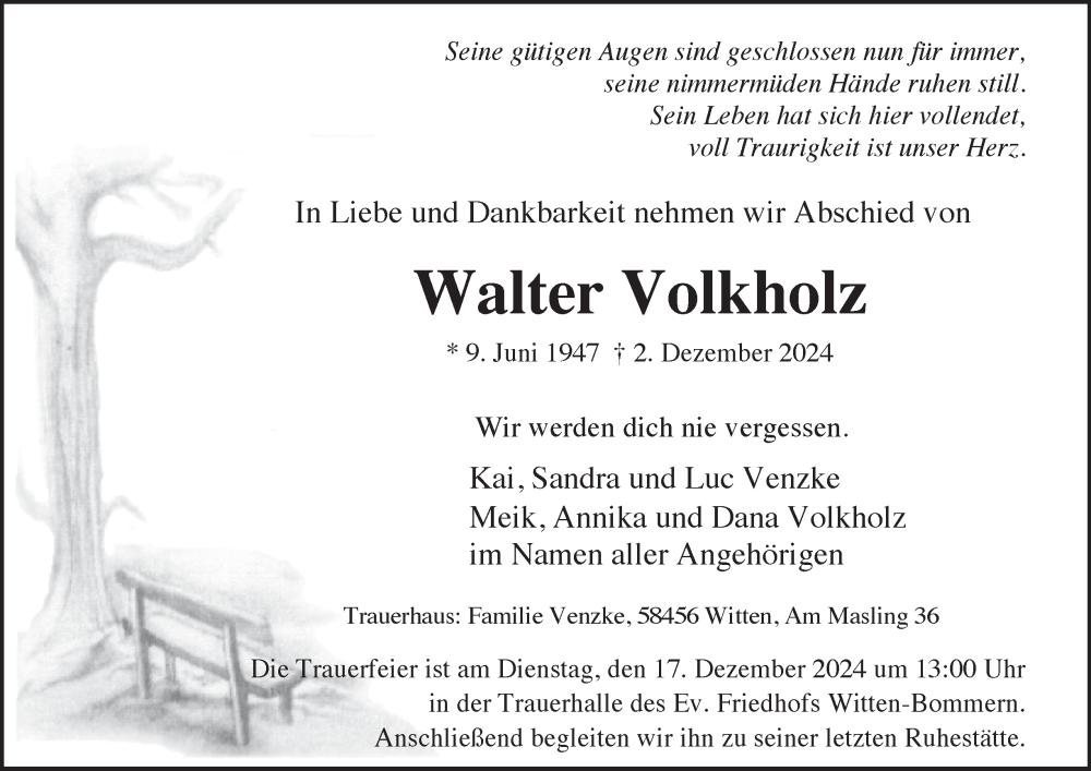 Hier finden Sie alle Traueranzeigen aus der Zeitung, die bisher für Walter Volkholz erschienen sind. Weitere Traueranzeigen, die in der Zeitung erscheinen, werden hier ebenfalls aufgelistet