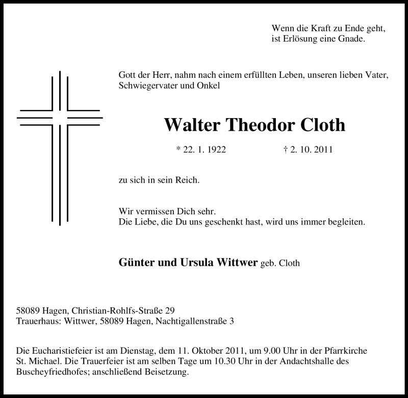 Hier finden Sie alle Traueranzeigen aus der Zeitung, die bisher für Walter Theodor Cloth erschienen sind. Weitere Traueranzeigen, die in der Zeitung erscheinen, werden hier ebenfalls aufgelistet