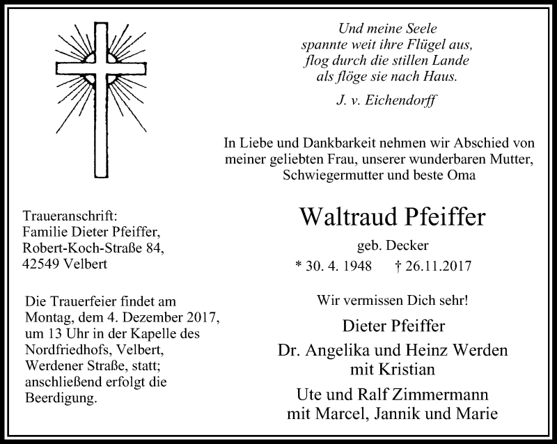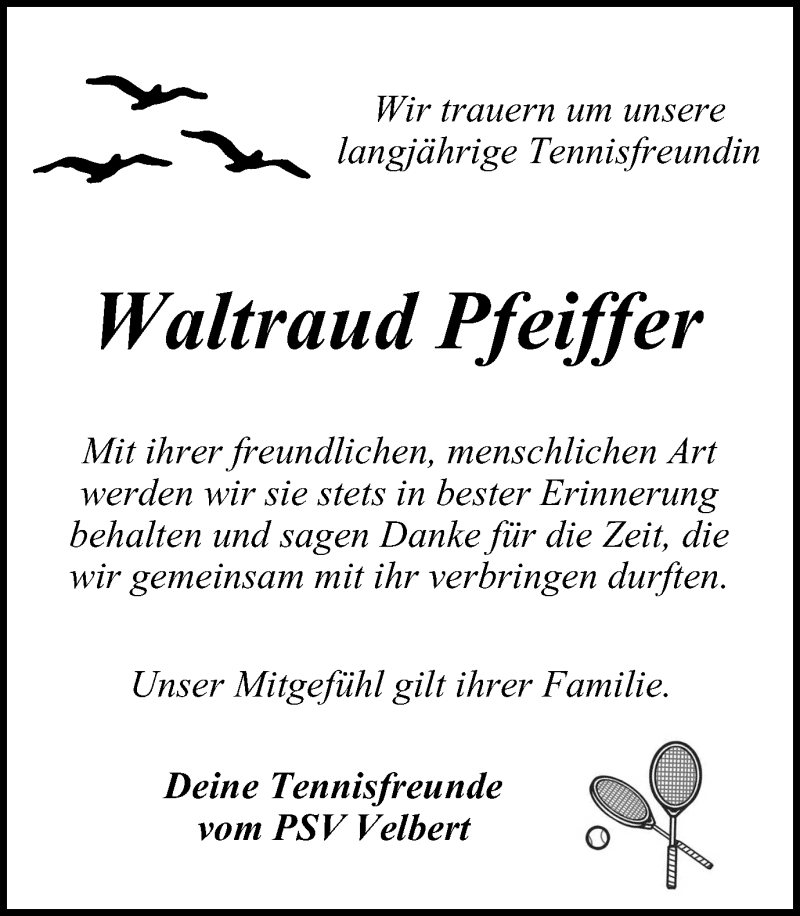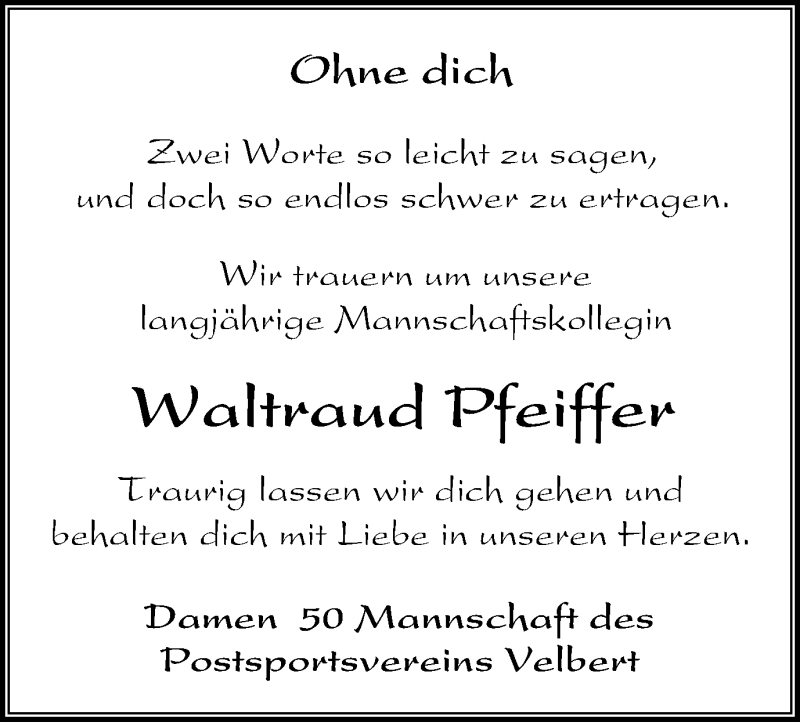 Hier finden Sie alle Traueranzeigen aus der Zeitung, die bisher für Waltraud Pfeiffer erschienen sind. Weitere Traueranzeigen, die in der Zeitung erscheinen, werden hier ebenfalls aufgelistet