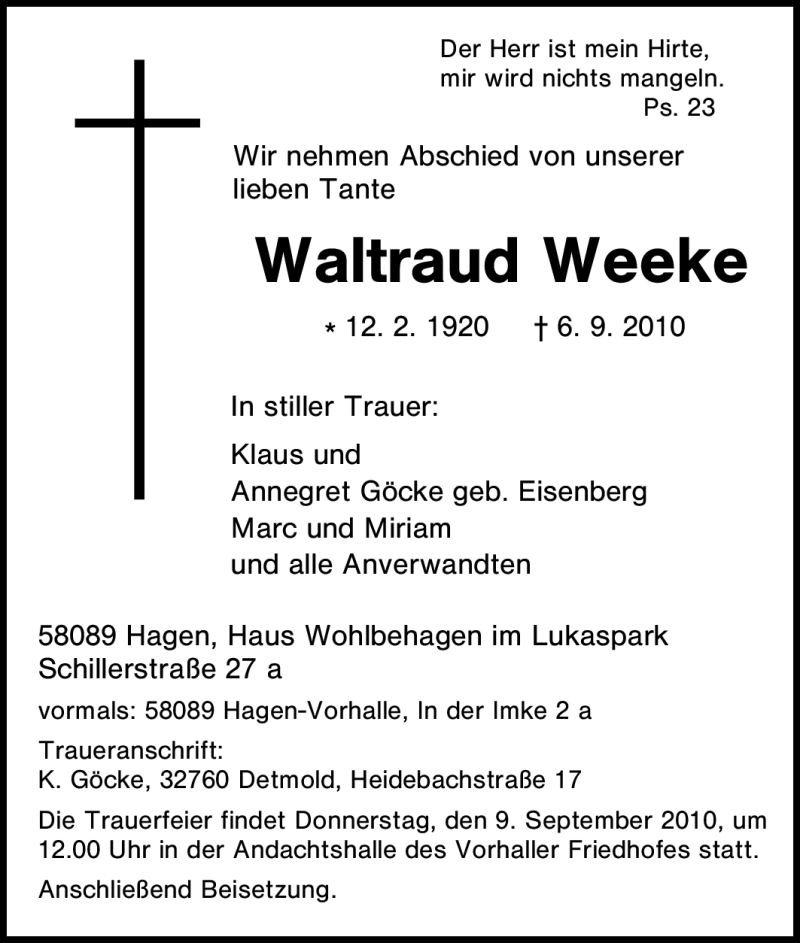 Hier finden Sie alle Traueranzeigen aus der Zeitung, die bisher für Waltraud Weeke erschienen sind. Weitere Traueranzeigen, die in der Zeitung erscheinen, werden hier ebenfalls aufgelistet