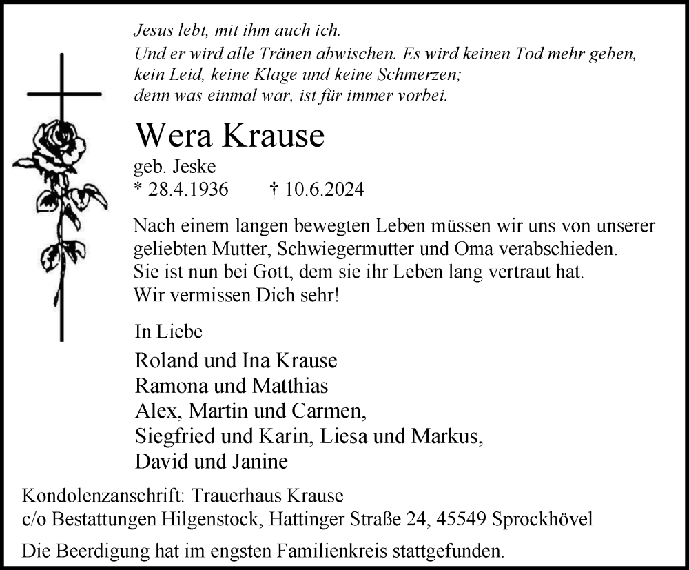 Hier finden Sie alle Traueranzeigen aus der Zeitung, die bisher für Wera Krause erschienen sind. Weitere Traueranzeigen, die in der Zeitung erscheinen, werden hier ebenfalls aufgelistet