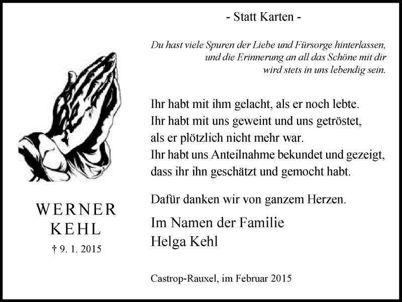 Hier finden Sie alle Traueranzeigen aus der Zeitung, die bisher für Werner Kehl erschienen sind. Weitere Traueranzeigen, die in der Zeitung erscheinen, werden hier ebenfalls aufgelistet