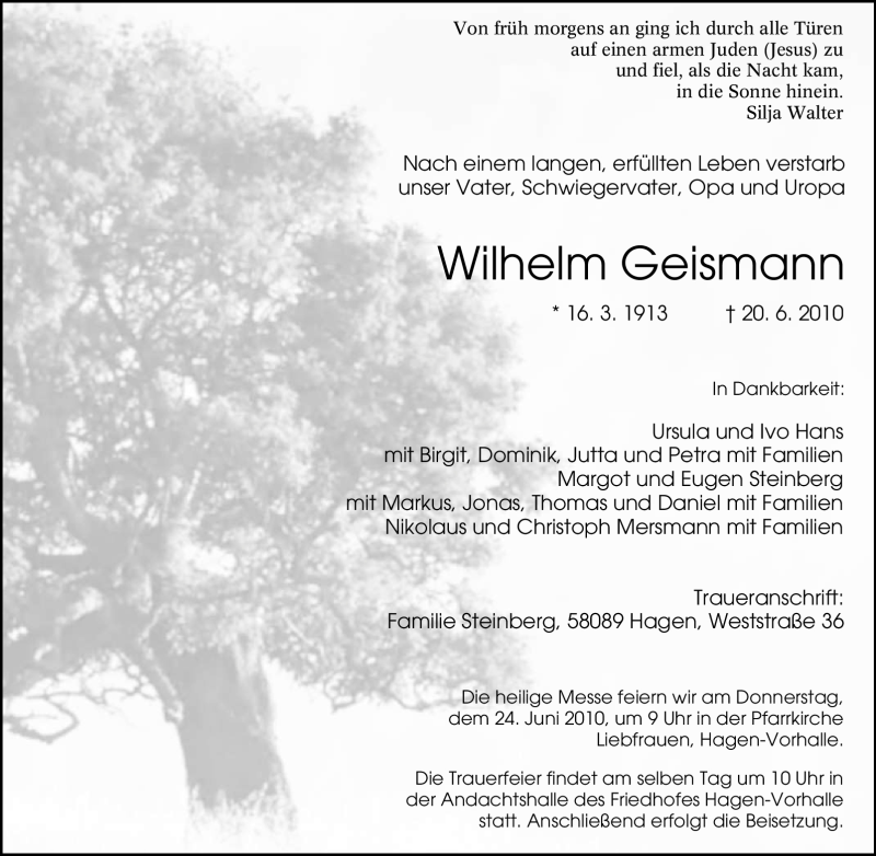 Hier finden Sie alle Traueranzeigen aus der Zeitung, die bisher für Wilhelm Geismann erschienen sind. Weitere Traueranzeigen, die in der Zeitung erscheinen, werden hier ebenfalls aufgelistet