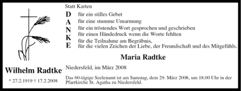 Hier finden Sie alle Traueranzeigen aus der Zeitung, die bisher für Wilhelm Radtke erschienen sind. Weitere Traueranzeigen, die in der Zeitung erscheinen, werden hier ebenfalls aufgelistet