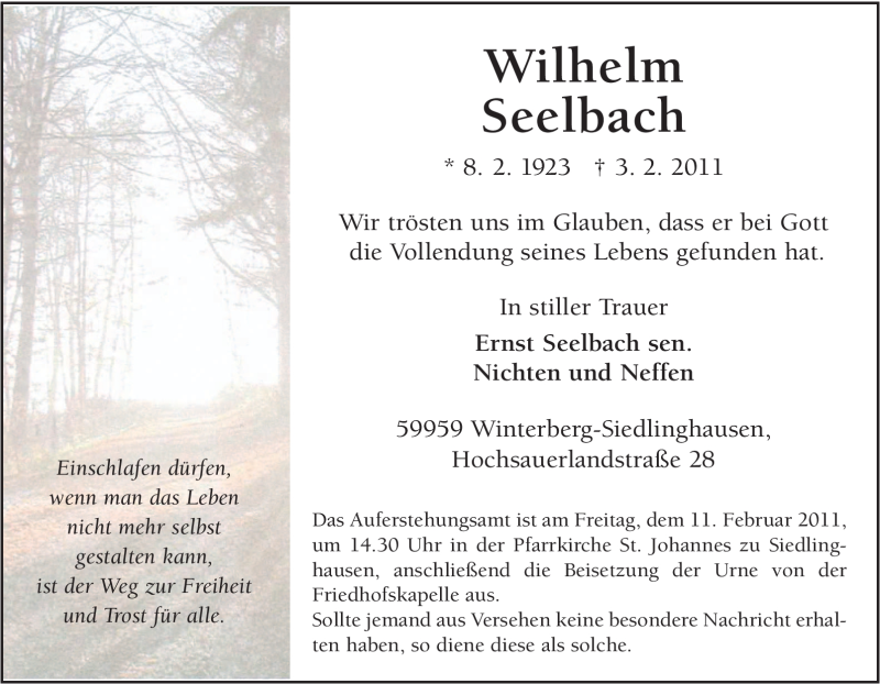 Hier finden Sie alle Traueranzeigen aus der Zeitung, die bisher für Wilhelm Seelbach erschienen sind. Weitere Traueranzeigen, die in der Zeitung erscheinen, werden hier ebenfalls aufgelistet