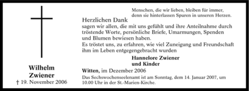 Hier finden Sie alle Traueranzeigen aus der Zeitung, die bisher für Wilhelm Zwiener erschienen sind. Weitere Traueranzeigen, die in der Zeitung erscheinen, werden hier ebenfalls aufgelistet