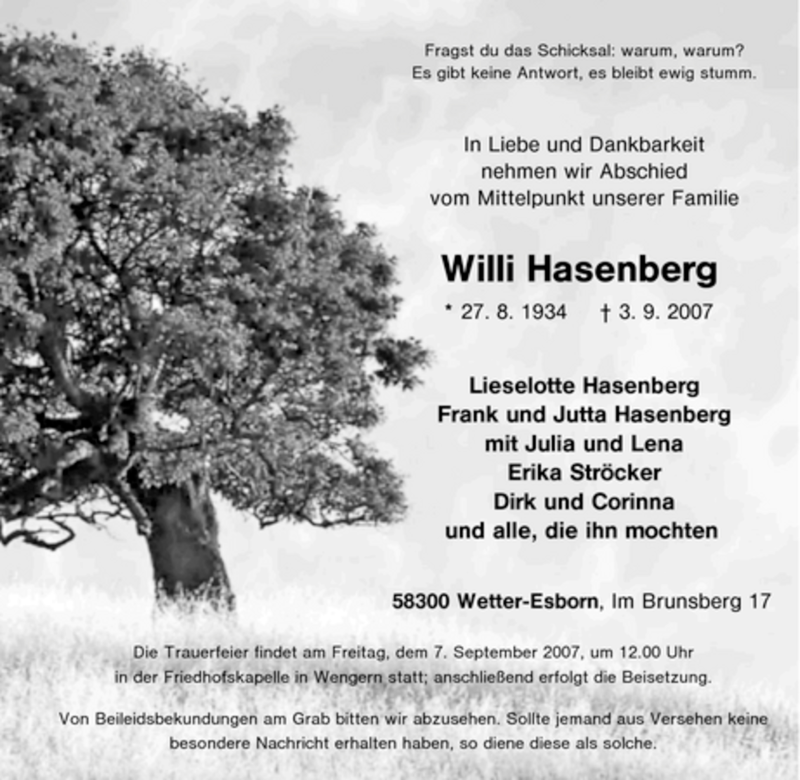 Hier finden Sie alle Traueranzeigen aus der Zeitung, die bisher für Willi Hasenberg erschienen sind. Weitere Traueranzeigen, die in der Zeitung erscheinen, werden hier ebenfalls aufgelistet