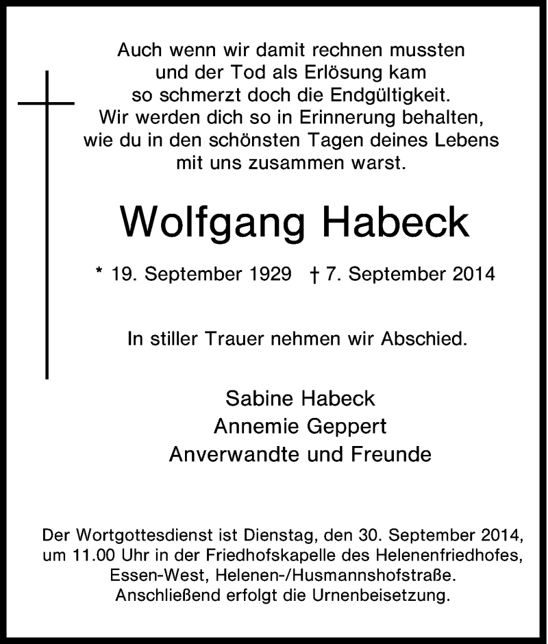 Hier finden Sie alle Traueranzeigen aus der Zeitung, die bisher für Wolfgang Habeck erschienen sind. Weitere Traueranzeigen, die in der Zeitung erscheinen, werden hier ebenfalls aufgelistet