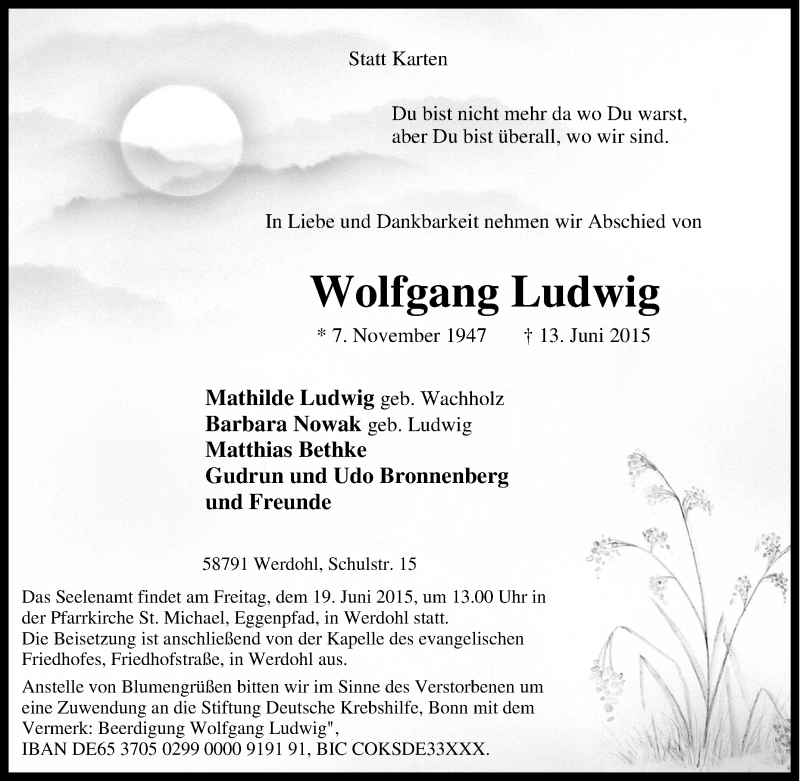 Hier finden Sie alle Traueranzeigen aus der Zeitung, die bisher für Wolfgang Ludwig erschienen sind. Weitere Traueranzeigen, die in der Zeitung erscheinen, werden hier ebenfalls aufgelistet