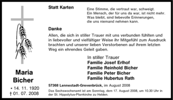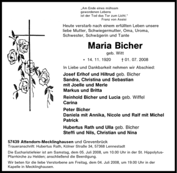 Anzeige Maria Bicher geb. Witt