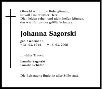Anzeige Johanna Sagorski geb. Gehrmann