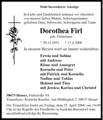 Anzeige Dorothea Firl geb. Gehrmann