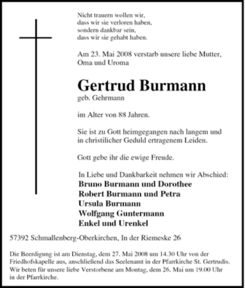 Anzeige Gertrud Burmann geb. Gehrmann
