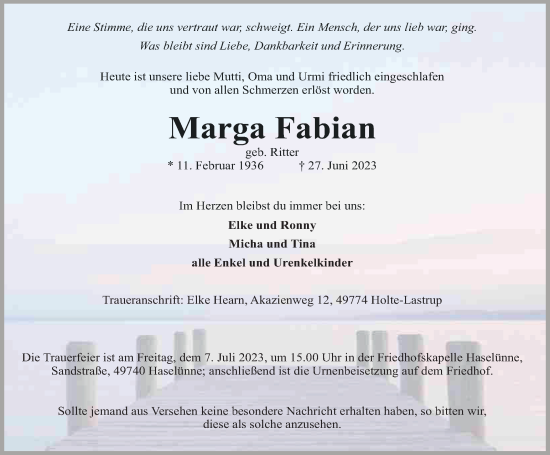 Anzeige Marga Fabian geb. Ritter