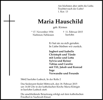 Anzeige Maria Hauschild geb. Kirmes