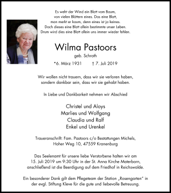 Anzeige Wilma Pastoors geb. Schroth