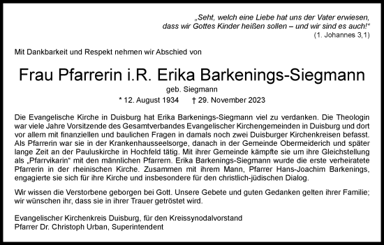 Anzeige Erika Barkenings-Siegmann geb. Siegmann