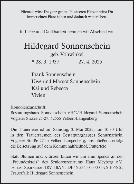 Traueranzeigen für den Suchbegriff "Velbert Langenbeg"