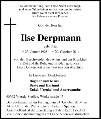Anzeige Ilse Derpmann geb. Fries