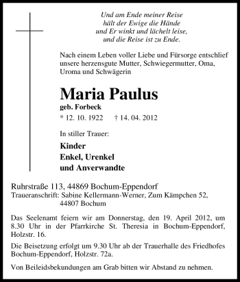 Anzeige Maria Paulus geb. Forbeck
