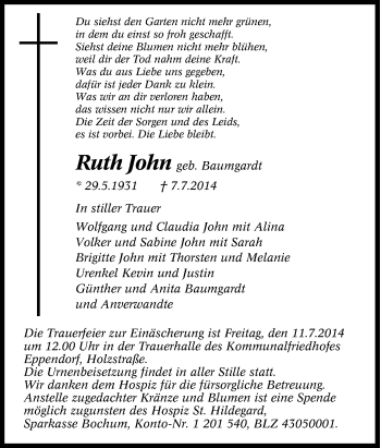 Anzeige Ruth John geb. Baumgardt